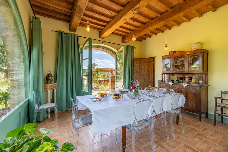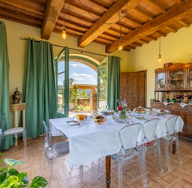 Il vecchio fienile, rinato. Una grande finestra panoramica esposta a ovest cattura i tramonti toscani, il camino riscalda le serate autunnali e la cucina completa ti offre la libertà di vivere come se fossi a casa tua, ma in una casa molto più bella.