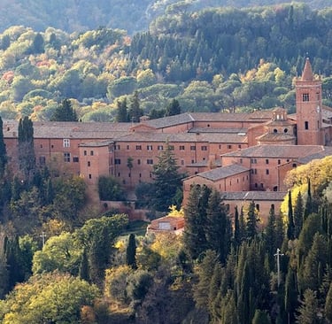 Only 1.5 km from Chiusure (but drive—the return climb is steep with 1,600 steps!). The abbey founded in 1319 by San Bernardo Tolomei is an absolute masterpiece immersed in a forest of cypresses and oaks. Cross the drawbridge under the crenellated tower and prepare yourself: the Great Cloister with frescoes by Sodoma and Luca Signorelli (36 scenes of St. Benedict's life, early 1500s) will leave you breathless. Each fresco is a world, colors still vivid after five centuries.