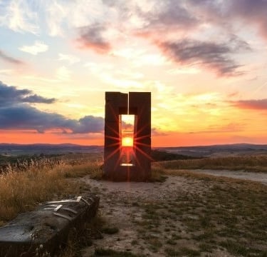 The work consists of four elements in Etruscan basaltine: a throne facing the landscape, a large stone window several meters high, a sarcophagus, and a labyrinth traced on the ground. The real magic lies in astronomical alignment: the artist designed the window so that on summer solstice day (June 21st), at sunset, the sun sets perfectly framed in the opening, offering a unique spectacle.