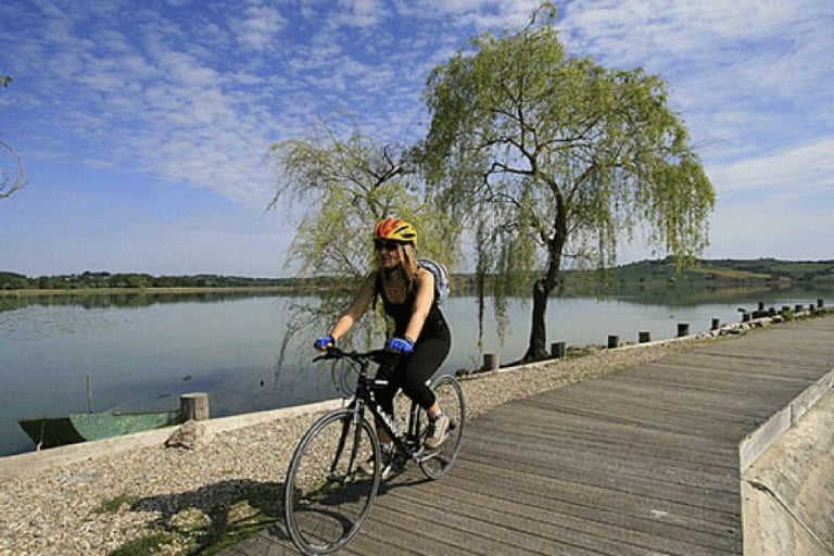Sentiero della Bonifica is perfect for those who aren't expert cyclists but want to pedal immersed in nature. The Chiusi-Montepulciano section (20 km one way) is what we recommend most: in 3-4 hours you've done a wonderful ride, seen beautiful landscapes, visited Montepulciano, eaten well, and returned to the Podere stress-free. Leave early morning (8-9am), arrive in Montepulciano for lunch, tour the village, then peaceful afternoon return. The Lake Chiusi Loop (12 km) is perfect for families with children or those wanting a quick, very easy ride. E-bike battery range: 70-80 km (more than sufficient for any Sentiero route).