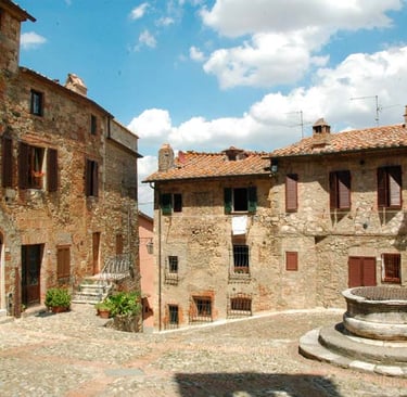 The heart of the village is Piazza Il Vecchietta, dedicated to painter and sculptor Lorenzo di Pietro called "il Vecchietta," born here in 1412. The square has an irregular triangular shape, paved with cobblestones of rough stones and cut by red brick strips. At the center, a 16th-century travertine well. All around, ancient palaces with their warm colors offer suggestive views. Looking up, you see the Rocca Aldobrandesca dominating from above — today it's in ruins and closed for restoration, but even just walking around it you admire the remains of medieval walls that for centuries defended this strategic place.