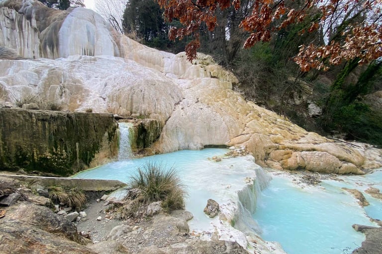Imagine climbing up to a fortress at 896 meters, with Val d'Orcia spread beneath you like a living painting. Then walking through medieval villages where time has stopped, with stone alleys and squares that look like movie sets. And finally immersing yourself in steaming thermal waters at 48°C, inside natural pools carved by time in the white rock of an enchanted forest.