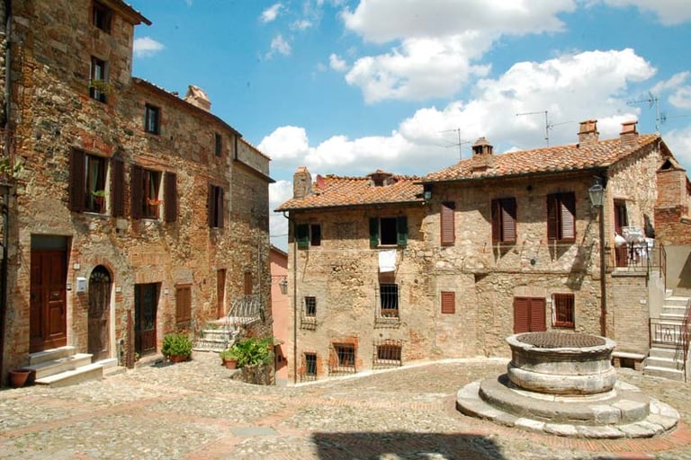 At the foot of the fortress, on the opposite side from Castiglione, lies the tiny village of Rocca d'Orcia — just 34 inhabitants. Its jewel is the Piazza della Cisterna, with an enormous medieval octagonal cistern defined in the 17th century as "the most beautiful vase in the State of Siena" for its water's quality. Houses climb along the uphill alleys, creating a timeless atmosphere.