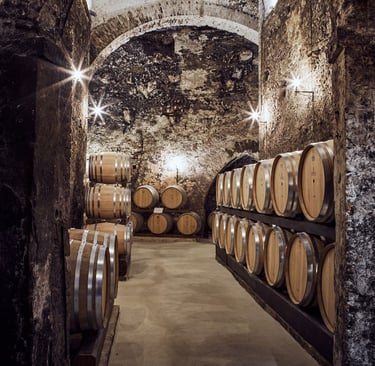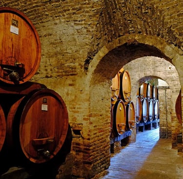15th-century Gothic-Renaissance underground city. Labyrinth of tunnels, hidden crypts, time-travel atmosphere. The barrels guard Vino Nobile and Vin Santo within walls steeped in history.