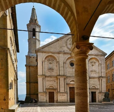 Piazza Pio II - Heart of the ideal city. Perfectly proportioned trapezoidal square, surrounded by: