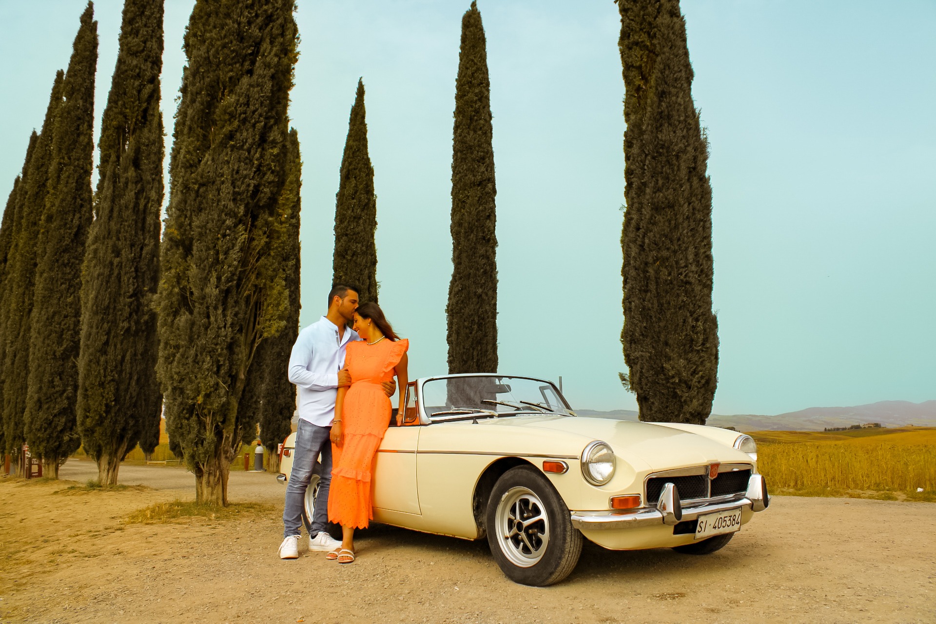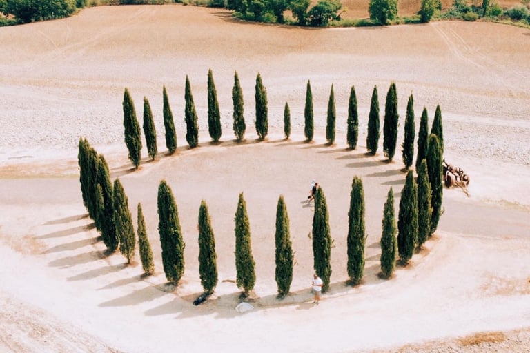 Imagine reliving all of this with a professional photographer by your side. Not selfies in front of monuments. Not random snapshots. A real photoshoot capturing you two in these dreamlike settings: sunset light, embraces under centuries-old trees, kisses with Val d'Orcia behind you.