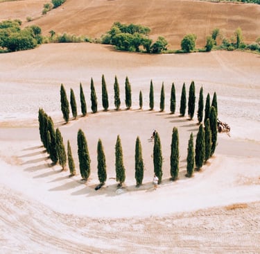 This isn't the classic "cypress road" everyone photographs. This one is less known, more intimate, perfect for a walk hand in hand while light filters through the tall trunks.