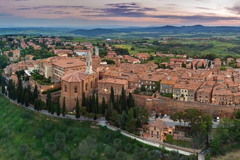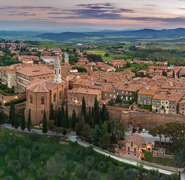 MONTALCINO if you want elegance and wine: Elegant, quiet, perched on the hills: Montalcino is the kingdom of Brunello, one of Italy's noblest wines. From the Fortress walls, your gaze embraces all of Val d'Orcia and the Crete Senesi. The village is small but refined: historic wine shops, stone alleys, an intimate atmosphere that invites you to slow down. Here wine isn't just for drinking: it's culture, it's history, it's the way this land speaks.