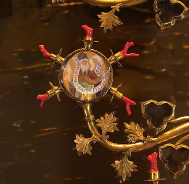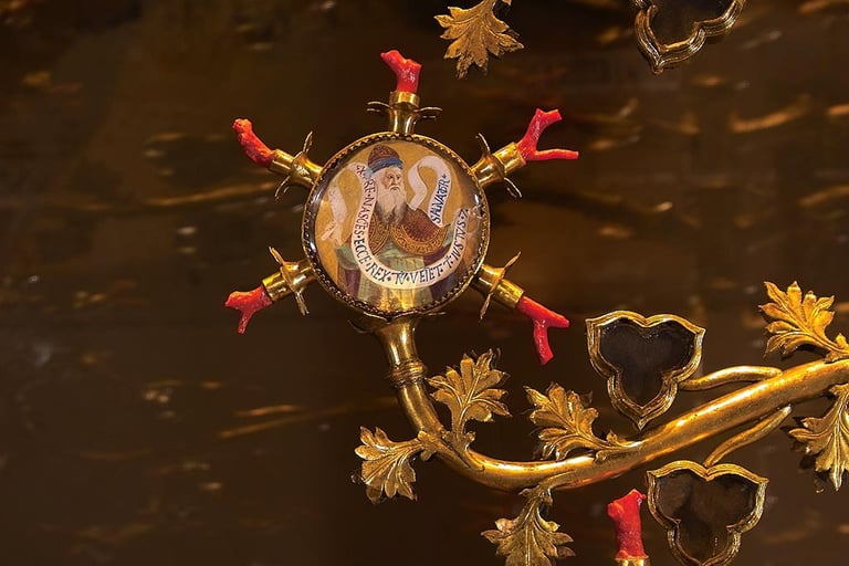 It's impossible to describe in words the beauty of this reliquary. It's a gilded copper tree, two and a half meters high, with 12 branches from which hang small trilobed cases that contained Franciscan relics and fragments of Christ's Cross. On top, a crucifix and a pelican (symbol of Christ sacrificing himself for humanity). Below, threads of red coral, rock crystals, enamels, precious stones.