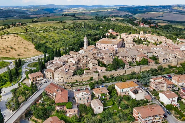 Perched at 564 meters, Montalcino dominates the valley with its 1300s medieval Fortress, one of Tuscany's best preserved. From the walls, the panorama embraces all of Val d'Orcia, the Crete Senesi, and on clear days, all the way to Monte Amiata.