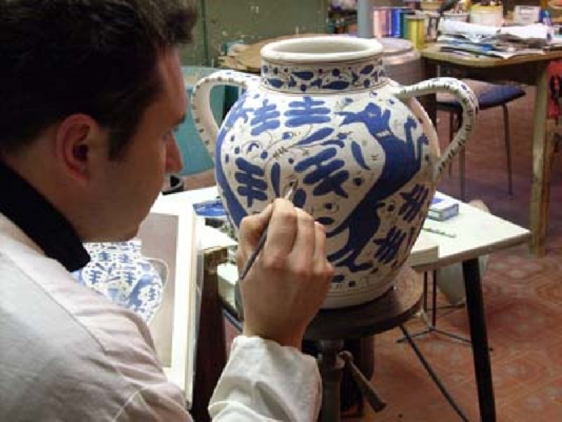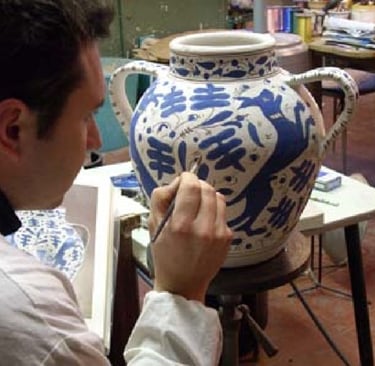 Impara le tecniche essenziali della decorazione ceramica toscana: dalla carteggiatura alla pittura su biscotto, dal trasferimento con spolvero alla smaltatura. Nessuna esperienza richiesta. Al termine del corso, le tue opere vengono consegnate al Maestro per la cottura finale nel forno della bottega — e ti vengono restituite entro due giorni, pronte per tornare a casa con te.