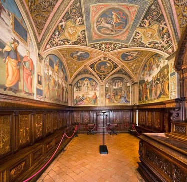 Il Collegio del Cambio era la sede dei banchieri medievali. Nel 1496 chiamarono il Perugino (all'epoca rockstar della pittura) per affrescare la Sala delle Udienze. Il risultato è un ciclo di affreschi che una scrittrice americana definì "uno dei tre soffitti perfetti del mondo".