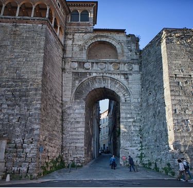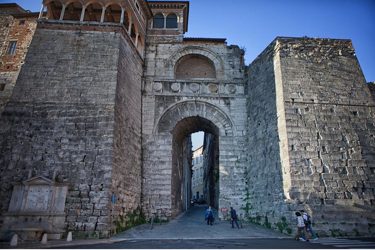 L'Arco Etrusco è una delle sette porte della cinta muraria etrusca. La base è etrusca (III secolo a.C.), sopra c'è un'aggiunta romana, in cima una loggia rinascimentale. È tipo un libro di storia verticale.